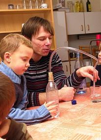 Die Anleitungen gab den Jugendlichen der Chemiker Dr. Jörg-Michael Schröder aus Bremen. Er hat sich mit seinem "Picolabor" auf Experimentierkurse, Ferienprogramme und Projekttage in Kindergärten, Schulen und Freizeiteinrichtungen spezialisiert. Sein Ziel: Kinder mit Experimenten an die Naturwissenschaften heranzuführen. Als Materialien dienen ihm haushaltsübliche einfache Dinge wie Kerzen, Luftballons, Backpulver und Essig. Spielerisch erforschen die Kinder, warum der Himmel blau ist und warum die Brause sprudelt.