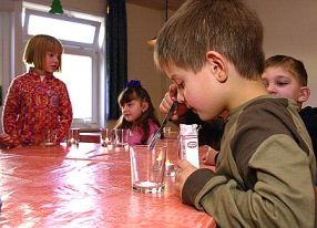 "Du hast da irgendwas reingegossen", ruft der sechsjährige Florian ganz aufgeregt, als eine in einem Glas stehende Kerze wie von Geisterhand erloschen ist. Eine Flüssigkeit war es nicht, denn die befindet sich immer noch auf dem Boden eines zweiten Glases, das Dr. Michael Schröder leicht gekippt über das Glas mit der Kerze hält. Die Lösung: Das nicht sichtbare Gas Kohlendioxid, das der Chemiker zuvor aus Natron und Essig hergestellt hat. Mit großen Augen verfolgen Jungen und Mädchen im Alter von sechs Jahren in der Kindertagesstätte Ströhen die verblüffenden Experimente von Michael Schröder. Nach kurzer Einweisung legen die kleinen Nachwuchschemiker dann selbst Hand an und löschen Kerzen mit Kohlendioxid.
